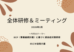 先日、全体ミーティングにて、BCP(事業継続計画)に基づく感染症対策研修を実施しました。 感染症は、いつ誰に起こるか予測が難しく、介護の現場では、日頃からの備えと正しい知識がとても大切になります。今回の研修では、感染症が […]